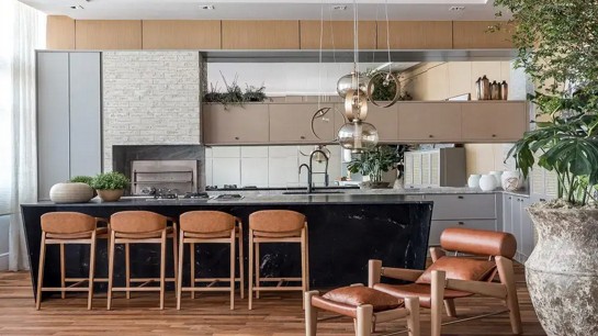 Todo o ambiente planejado faz parte da Coleção Átomo, lançamento da Criare. Inspirada na arquitetura vernacular, a Coleção Átomo é uma verdadeira jornada de busca às origens, com foco na mãe Terra. Os materiais empregados são sustentáveis e originais. “Agredir menos a natureza se mostrou fonte de inspiração para uma arquitetura cheia de vida em um mundo mais consciente e humano”, conta Mariana, que destaca a grande ilha em mármore preto, toda sextavada, como um dos pontos de atenção do espaço, além das grandes portas que fazem integração com a área externa.