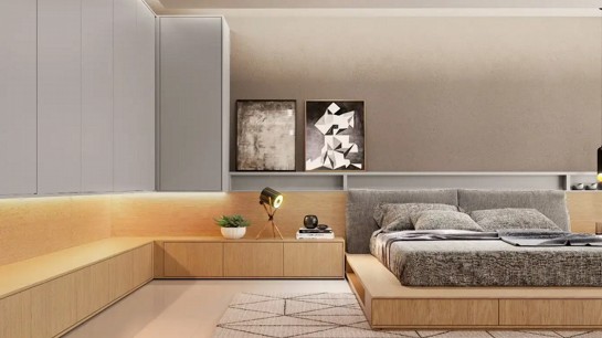 Neste projeto de quarto desenvolvido pela Criare, o padrão amadeirado Noce Madri foi utilizado nos armários inferiores e na base da cama. Foto: Divulgação.