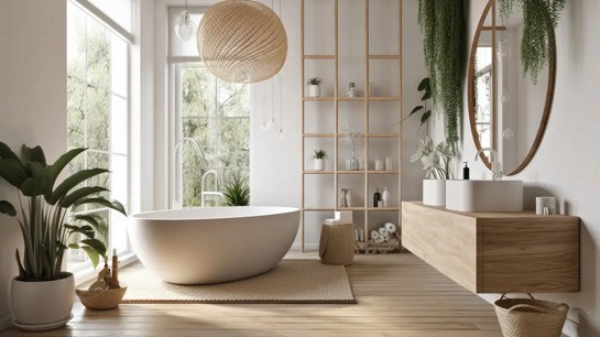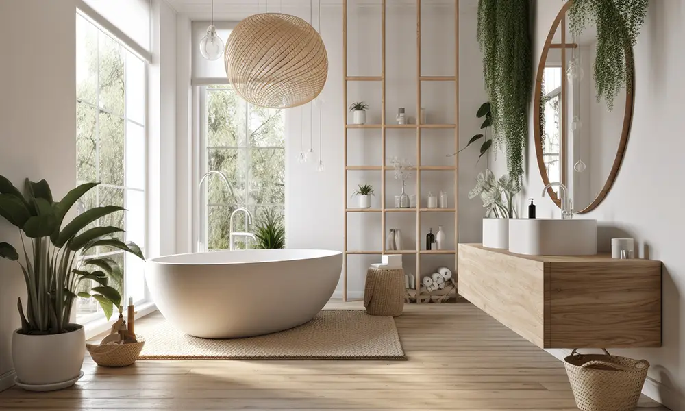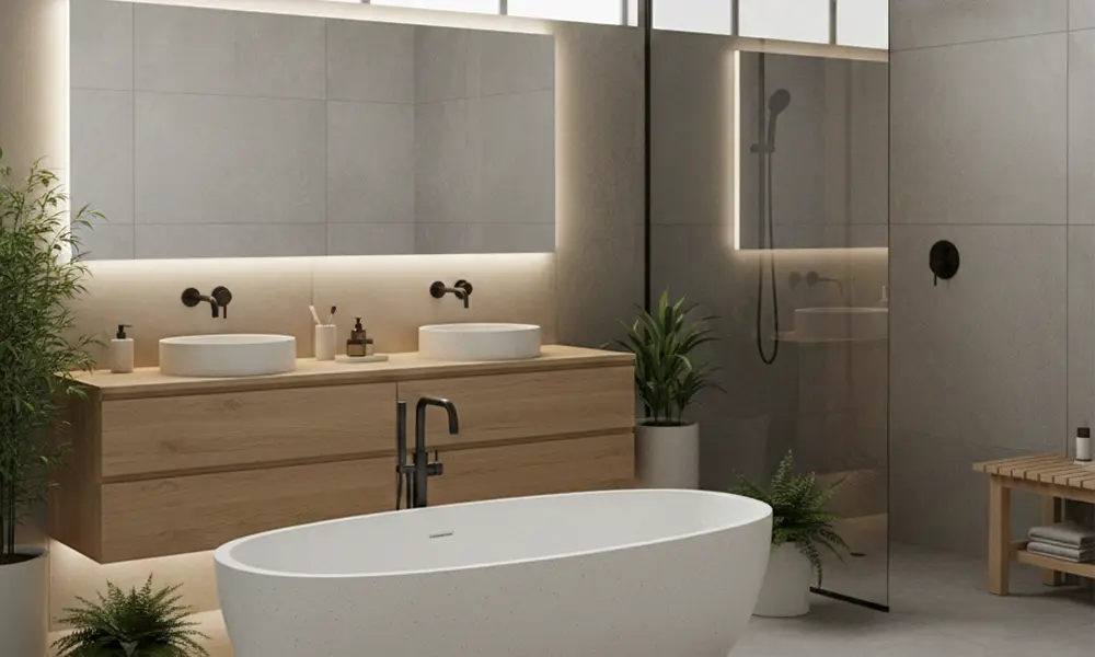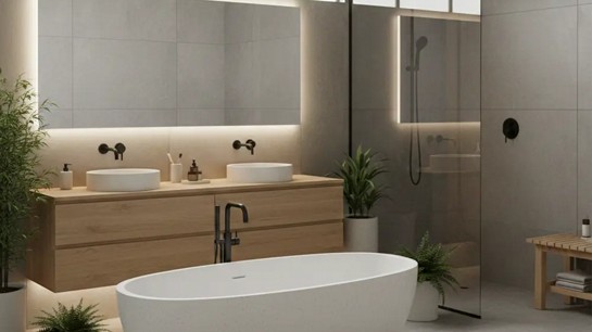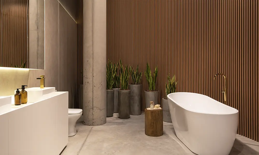Plantas naturais, especialmente espécies adaptadas à umidade, complementam o espaço trazendo vida e reforçando a conexão com o natural. No estilo spa, o design evita contrastes agressivos e excesso de informação, criando um ambiente silencioso e acolhedor.