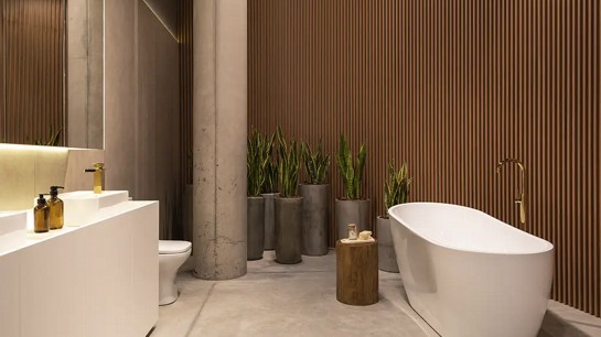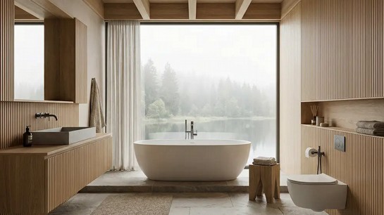 A presença de materiais naturais, especialmente a madeira, tem papel importante nesse contexto. Pesquisas em neuroarquitetura mostram que superfícies que remetem à natureza ajudam a ativar áreas do cérebro associadas à sensação de segurança e bem-estar. Quando aplicada em móveis planejados, painéis ou detalhes construtivos adequados para áreas úmidas, a madeira contribui para um ambiente mais quente e confortável.