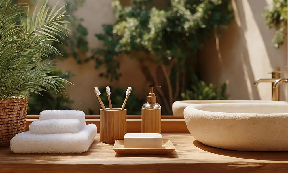Evitar excesso de objetos é essencial. Em uma sala de banho elegante, poucos acessórios bem escolhidos têm mais impacto do que muitos itens decorativos sem função clara.