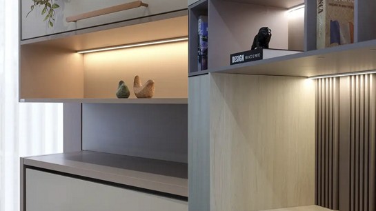 Nos móveis planejados, essa integração começa na estrutura. Perfis de LED embutidos em painéis e prateleiras criam iluminação indireta contínua, eliminando pontos de sombra e valorizando texturas. Em cozinhas planejadas, a iluminação linear sob armários superiores melhora a visibilidade da bancada sem interferir na composição estética. Já sistemas de iluminação interna em gavetas profundas ou despensas facilitam o uso diário e reduzem a necessidade de luz geral intensa.